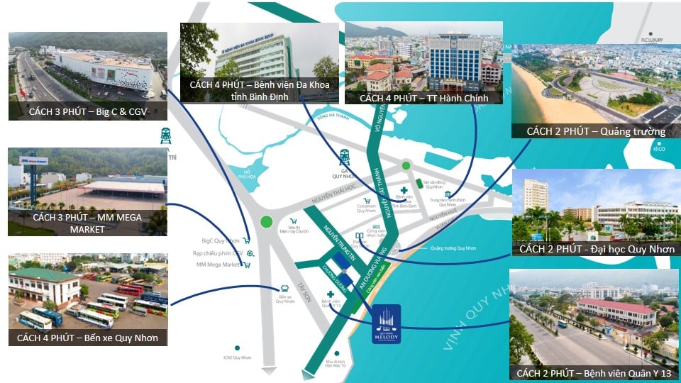 Quy Nhon Melody tọa lạc trên cung đường huyết mạch của TP. Quy Nhơn với 3 mặt tiền đường ven biển: Nguyễn Trung Tín – An Dương Vương – Chương Dương. Với địa thế thuận lợi cách bãi biển Quy Nhơn thơ mộng vài bước chân cũng như dễ dàng tận hưởng mọi tiện ích trong bán kính 3km, Quy Nhon Melody mang đến lợi nhuận kép vượt trội khi khai thác cho thuê và gia tăng giá trị trong tương lai.
