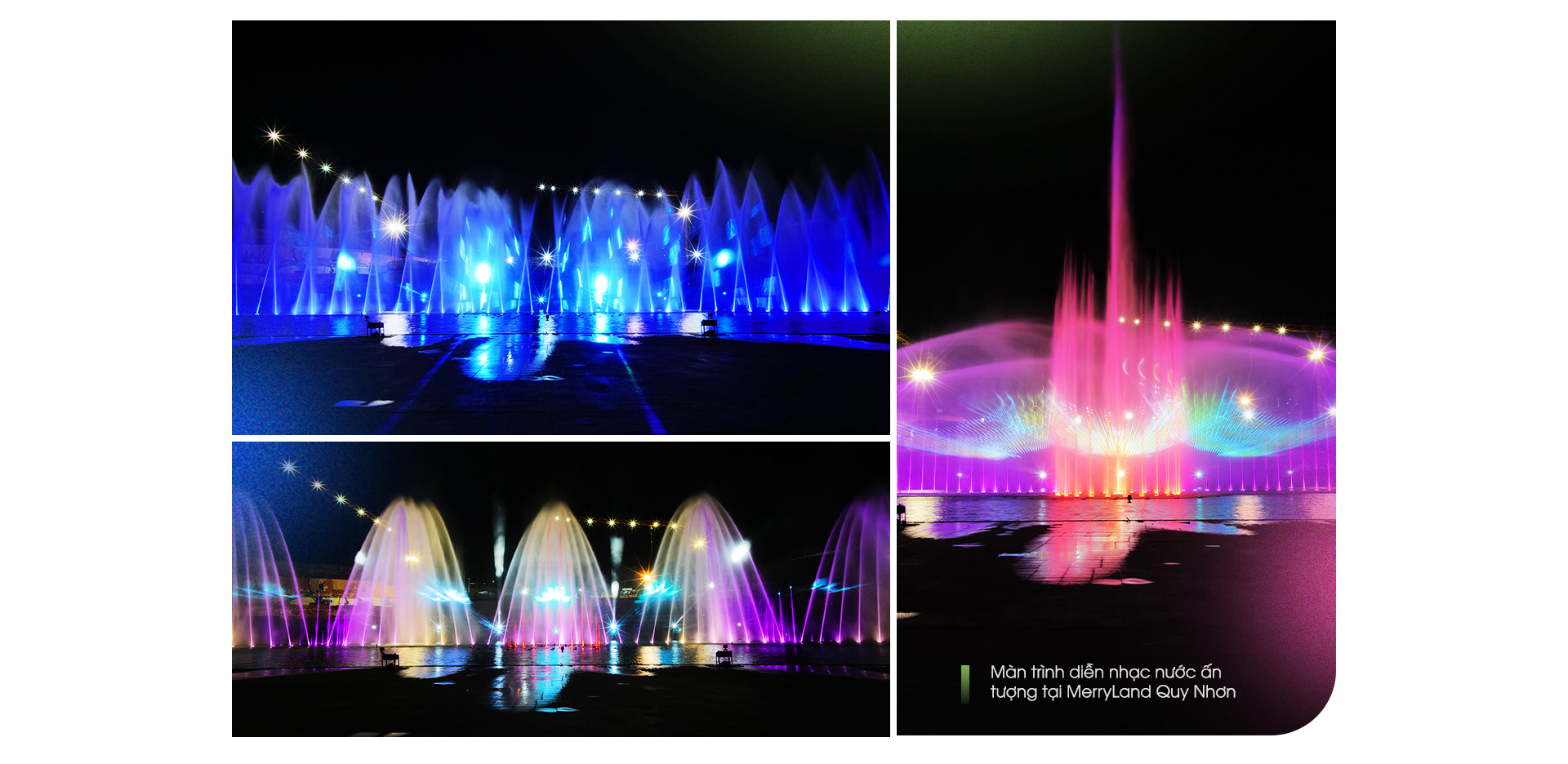 – Quảng trường nhạc nước ở MerryLand Quy Nhơn thật sự rất lớn. Nơi đây sẽ được lắp đặt hơn 300 vòi phun nước với độ cao từ 30-50m. Xen kẽ với đó là các vòi phun lửa khổng lồ với độ cao lên tới 20m. Chúng tôi sử dụng công nghệ chiếu tia laser mới nhất và nhiều công nghệ khác để mang đến cảm xúc và tạo ra khoảnh khắc đáng nhớ nhất.