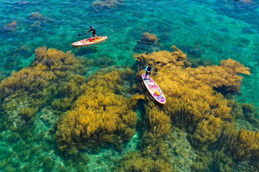 Mùa nước cạn, đến Nhơn Hải bạn đừng bỏ qua việc tắm biển, lặn ngắm san hô và còn gì thú vị bằng việc bơi thúng dạo quanh các rạn san hô, lên tường lũy tham quan rồi ngâm mình dưới biển khám phá những điều kỳ thú. Mực nước tại các khu vực gành, rạn san hô tại đảo Hòn Khô hay quanh khu vực tường lũy rất cạn, chỉ cần một chiếc kính lặn đơn giản bạn cũng có thể quan sát dưới nước, ngắm từng đàn cá đủ màu sắc tung tăng bơi lội chen mình giữa các đám rong mơ.