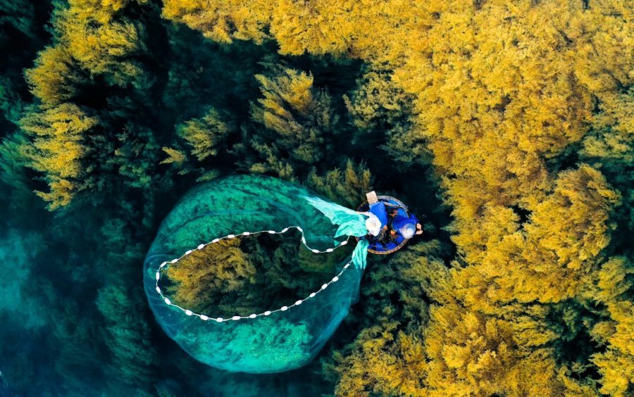 Nếu “săn ảnh” mùa rong, sắc ảnh cũng tùy thời khắc chụp mà thay đổi từ nâu sang đỏ, cam, vàng,… Nếu phóng tầm mắt từ trên cao nhìn xuống, ai cũng sẽ ngỡ ngàng bởi vẻ đẹp tựa tranh vẽ của mặt biển trong xanh xen lẫn màu vàng nâu của những đám rong mơ ngoi mình lên mặt nước, đu đưa theo dòng chảy, quyến rũ lạ kỳ!