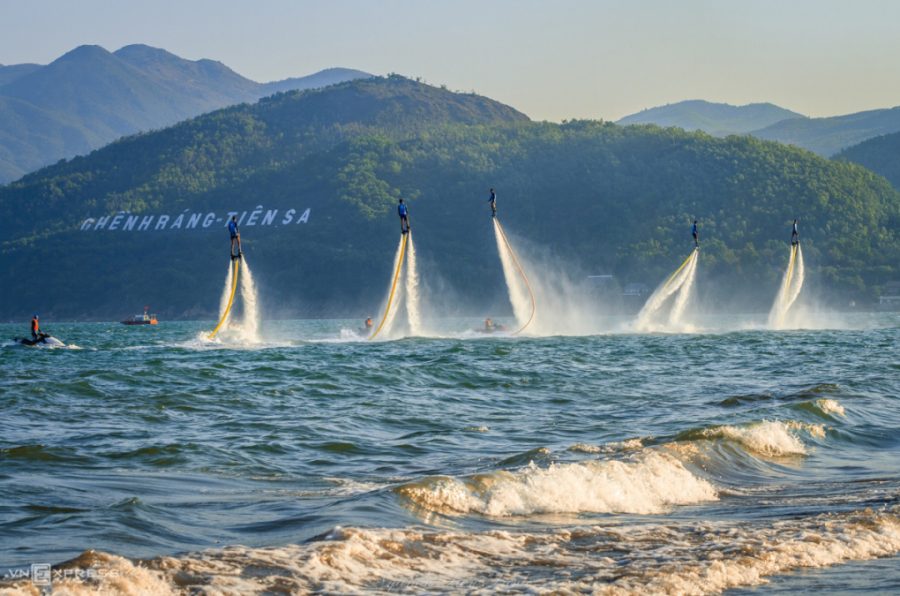 Du khách chơi môn flyboard tại Ghềnh Ráng – Tiên Sa. (Ảnh: Nguyễn Tiến Trình).